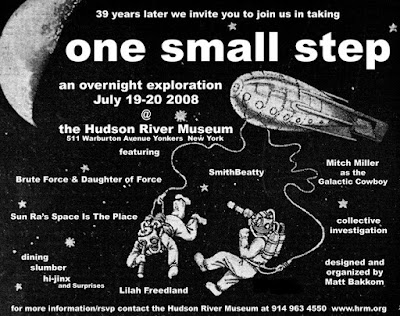 It's not the Museum of Natural History, it's Yonkers own Hudson River Museum. They are sponsoring a program to celebrate the 39th anniversary of Neil Armstrong landing on the moon with an overnight program they are calling One Small Step. It's an installation curated by artist Mathew Bakkom, an artist who is perhaps best known for his creation/installation of the New York Museum of Complaints. Bakkom's work typically seems to involve archival research followed by fanciful and sometimes provocative exhibitions and sculptures provoked by the research.The Museum has planned a whole night outing, and geared it for adults-- you have to be over 21 to attend. Read more below.
